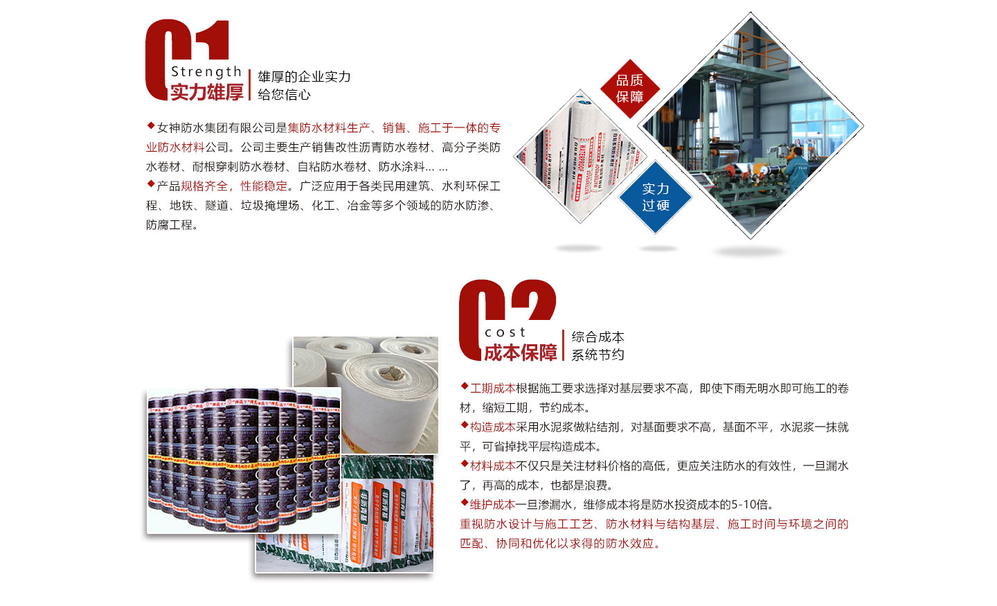 安徽女神建材科技集團有限公司是集防水材料研發(fā)、生產(chǎn)、銷售、施工為一體的綜合性防水材料集團公司。我公司旗下有多條大型一次成型生產(chǎn)線:SBS改性瀝青防水卷材,DTM聚酯復合高分子防水卷材,非瀝青基高分子防水卷材,PVC,TPO高分子防水卷材等生產(chǎn)線。我公司秉承“創(chuàng)新發(fā)展、實惠用戶”為宗旨,確保生產(chǎn)材料基礎上推出“共享生產(chǎn)廠家”,為開發(fā)商、建筑商節(jié)約成本為理念,新理念受到用戶企業(yè)集采時一致好評和認可。在互聯(lián)網(wǎng)時代,我公司將以互聯(lián)網(wǎng)“共享”為發(fā)展理念,為開發(fā)商、建筑商、防水企業(yè)提供的產(chǎn)品,真正讓用戶企業(yè)達到巨大...
